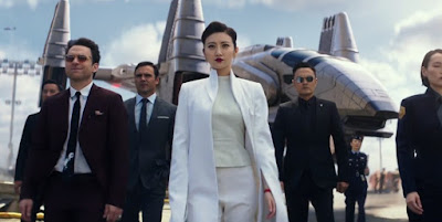 不免俗一提,景甜。《環太平洋》出場人物跨國界跨人種,不是新鮮事,但儼然「中國代表隊」的景甜不僅在戲裏擔綱多重角色,更具多重意義。當由景甜飾演的「邵氏企業」負責人——立雯,對麾下白人科學家一句「你說中文的時候像個白痴」才脫口,觀眾看見的不但是一名高傲自負的企業家,而更感受某種取替大美國英雄主義的銀幕企圖,冉冉而生。這點,早在2016年中資萬達集團收購向來擅長製作特效、怪獸電影的傳奇影業(Legendary Pictures, Inc.)時,似乎已能預見。不光是網友玩笑無役不與的「景甜宇宙」形成,景甜在《環2》片中的身分,橫跨企業主、科學家,最後,由她獨力駕駛的機甲獵人,更成為協助男女主角化險為夷,進而擊殺魔王怪獸的致勝關鍵。在劇本篇幅有限的前提下,景甜與立雯,被塞入了爆表的成就期待,雖然令角色形塑十分破碎,卻代表也宣告:財力、權力、智力與武力,如何同時集於一人一身、一國一身。